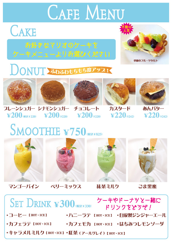 イートインでゆったりくつろげるマリオデザートです! 今までのマリオデザートとは一味違う、デザート&カフェです。 お買物帰りに、ゆったりカフェで当店だけのスペシャルデザートはいかがですか?開放的な店内で気分もリフレッシュします。 マリオデザート&カフェ イートインメニュー[pdf:1.72MB] |