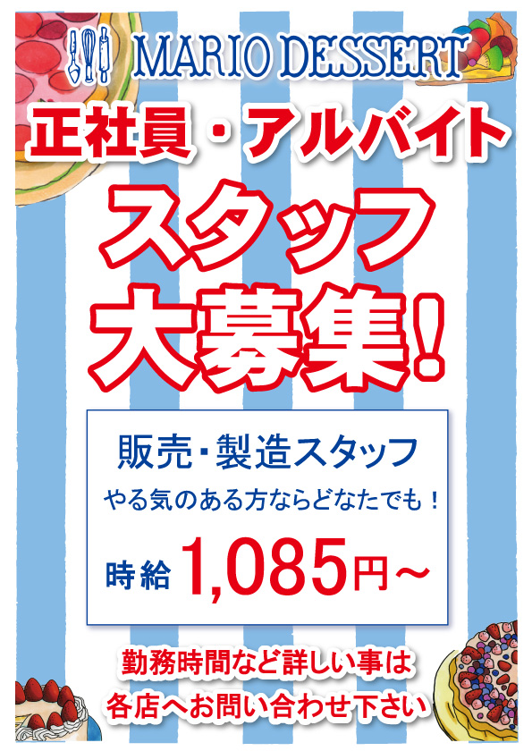 マリオデザートは広島市内を中心に6店舗にて営業中!ケーキは常時25~30種、そのほか焼き菓子なども取り揃えています。元気のいいスタッフとご来店お待ちしていまので、ぶらりと気軽にお立ち寄りください。